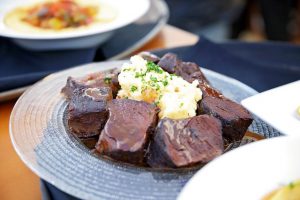 What says more Holiday Party Catering San Diego, than a warm and cozy Polenta Bar! (presented in oversized martini glass) Creamy polenta with short rib and a variety of topping to choose from: Achiote shrimp, artichoke hearts, oven dried tomatoes, blueberries, caramelized onions, sautéed mushrooms, frizzled leeks, basil, parmesan and mascarpone.